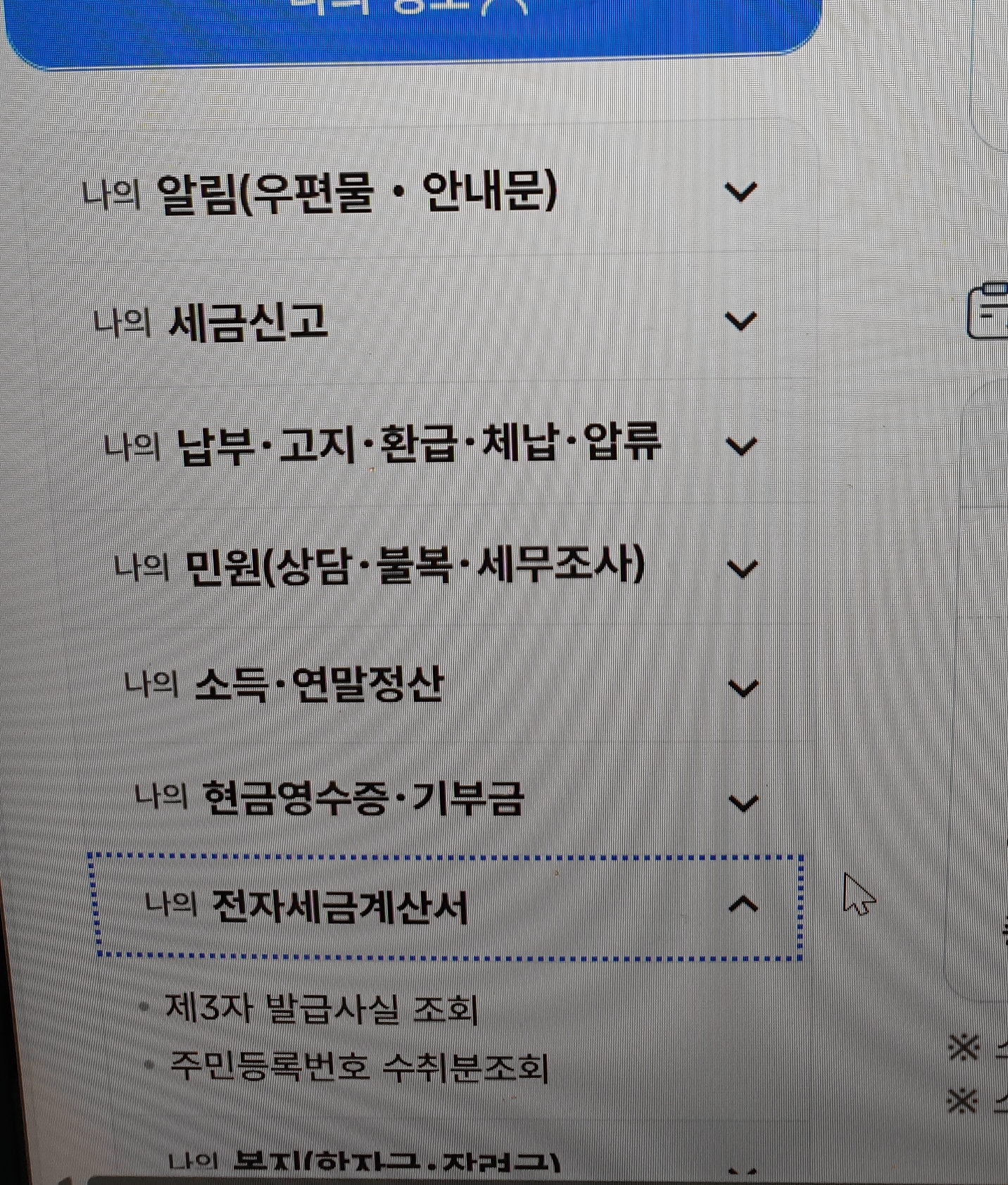 - 나의홈택스 좌측 리스트 하단쪽 나의 전자세금계산소 클릭.