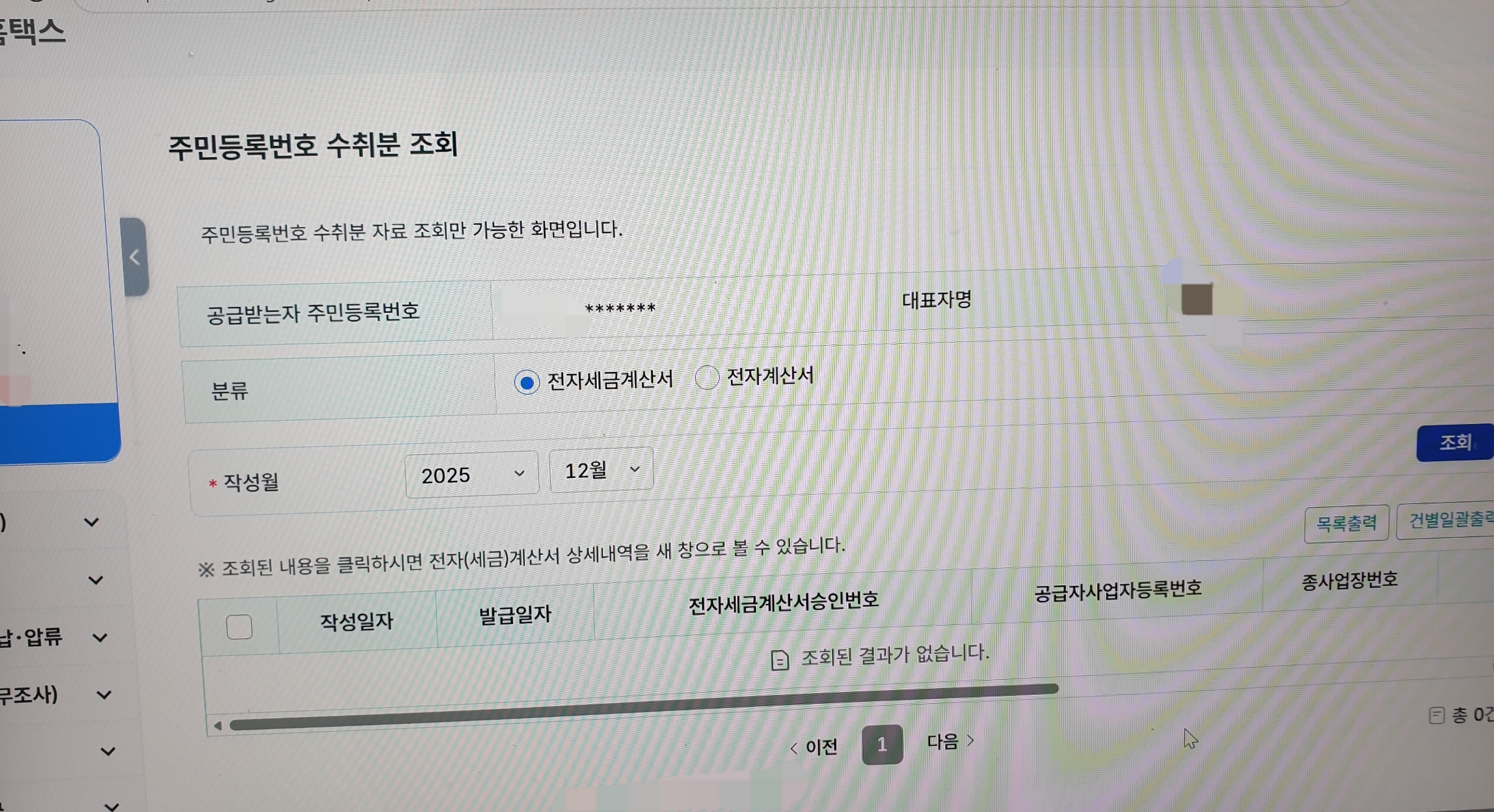 - 주민번호 수취분 조회를 누르면 아무것도 뜨지 않으므로 아래 내용을 입력해줘야 한다